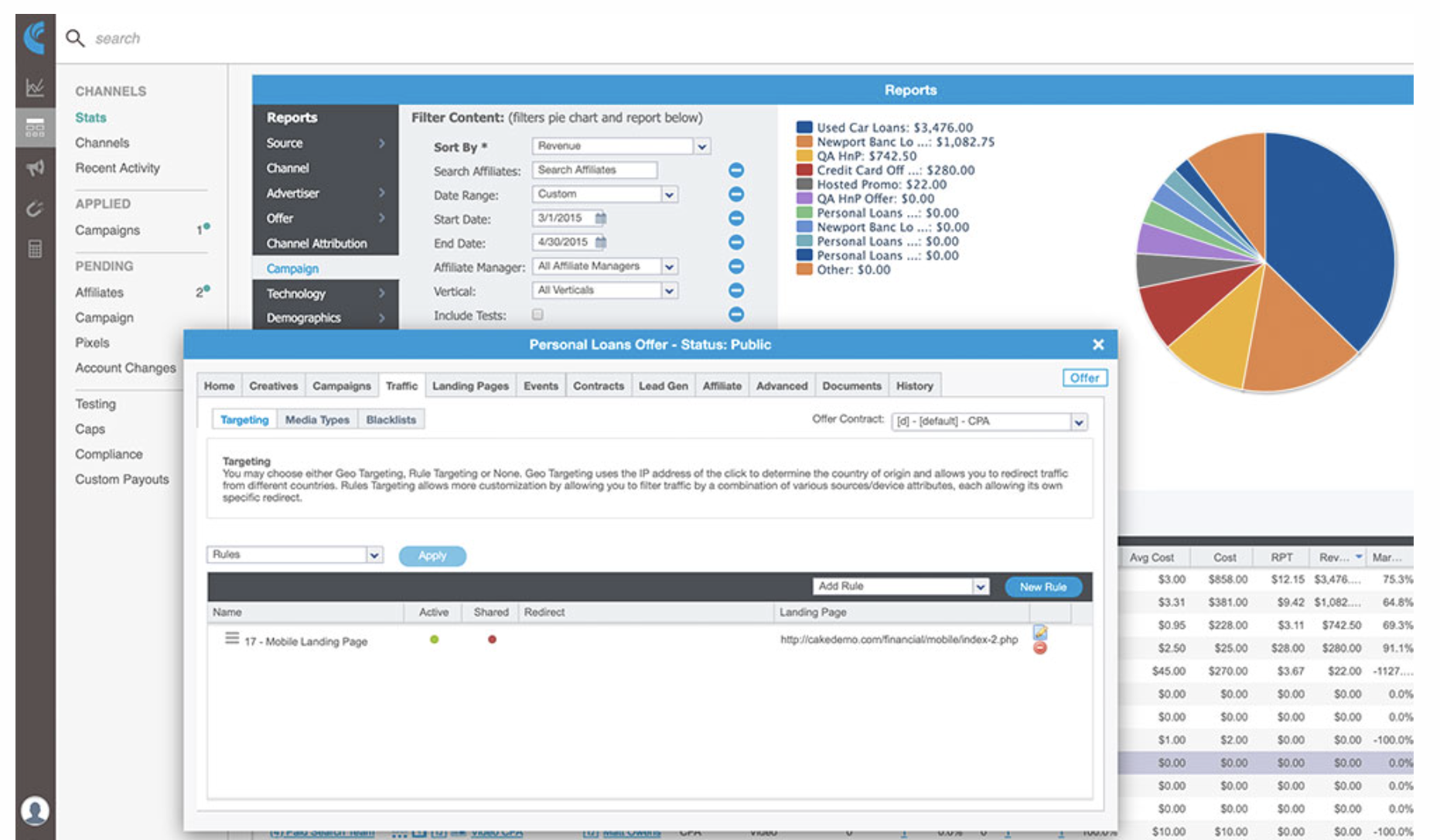 It offers custom targeting parameters, flexible event tracking, pixel/postback integrations, and tools for building branded application flows, landing pages, and contracts.